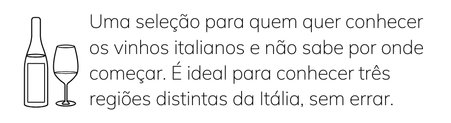Itália Sem Erro é uma seleção pensada para quem deseja começar a explorar os vinhos italianos com segurança e prazer. Reunimos três rótulos de diferentes regiões e estilos: um clássico Chianti DOCG Arbos da Toscana, um elegante blend de Abruzzo que expressa a força dos tintos de Abruzzo, e um moderno Roma DOC Rosso do Lazio, que combina Montepulciano, Syrah e Merlot. Uma coleção ideal para quem está dando os primeiros passos no universo dos vinhos da Itália e quer descobrir diferentes expressões do país — sem erro.