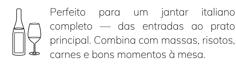A Coleção Jantar Italiano reúne 6 rótulos versáteis e elegantes — 5 tintos e 1 rosé — pensados para harmonizar com a gastronomia italiana. Do frescor do Rosé La Fleur ao corpo e intensidade dos tintos de Abruzzo e Piemonte, é a escolha ideal para quem aprecia vinhos de personalidade e quer transformar qualquer refeição em uma verdadeira experiência italiana.