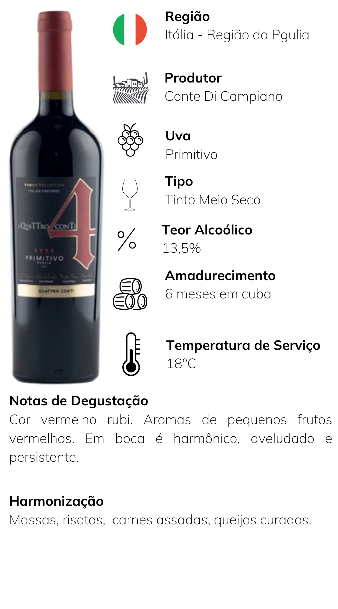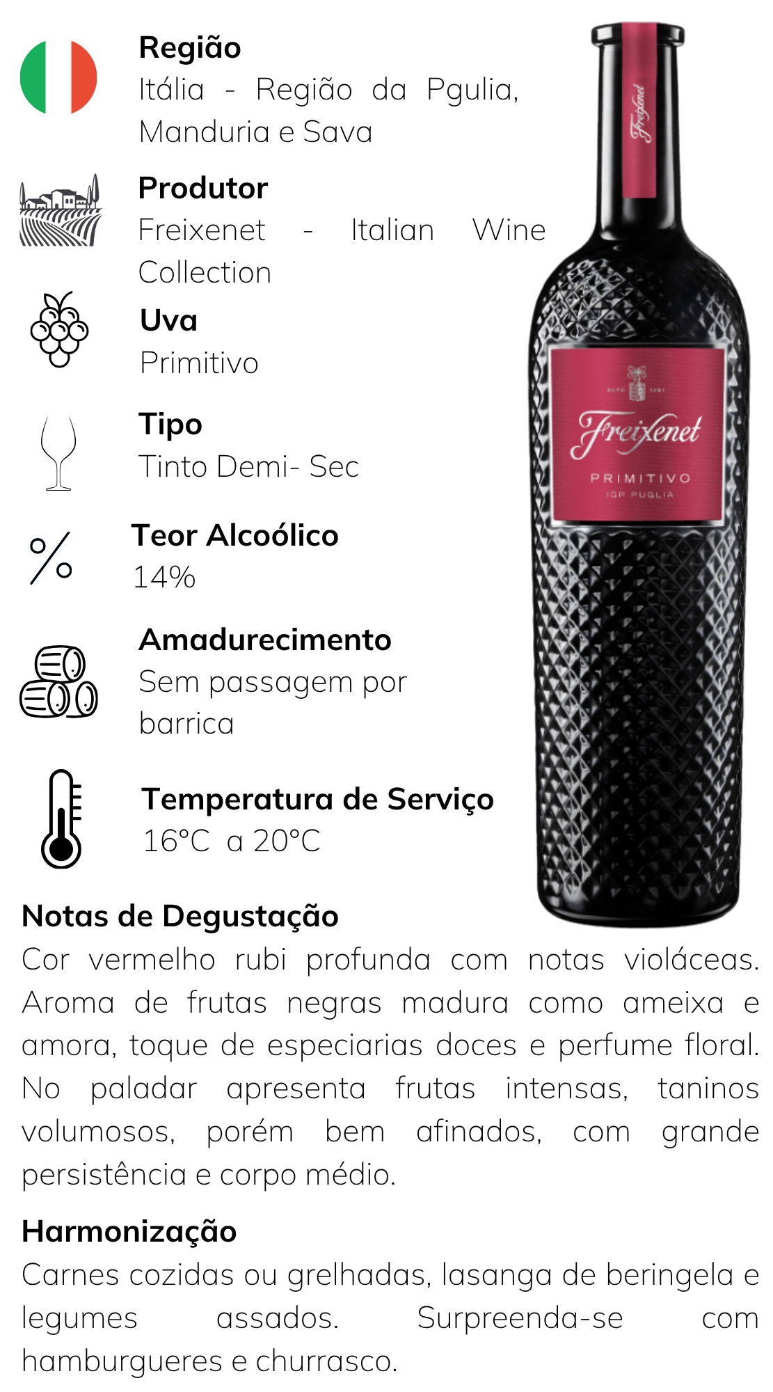 A coleção O Melhor da Primitivo reúne quatro interpretações da uva mais intensa do sul da Itália — do caráter robusto do Primitivo di Manduria DOC Sessantuno ao frescor moderno da Freixenet, passando pela elegância da versão Riserva e pela autenticidade do Primitivo Puglia IGT 4 Conti. Um kit especial para os verdadeiros amantes de Primitivo, que desejam explorar toda a potência, o calor e a personalidade dessa casta icônica.