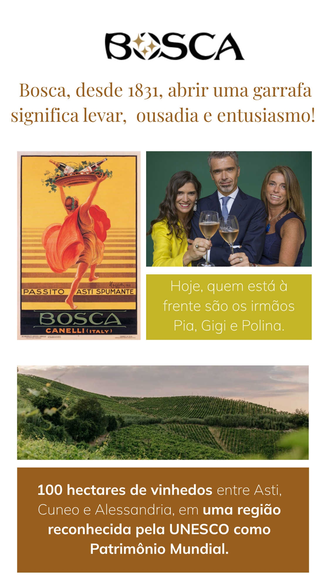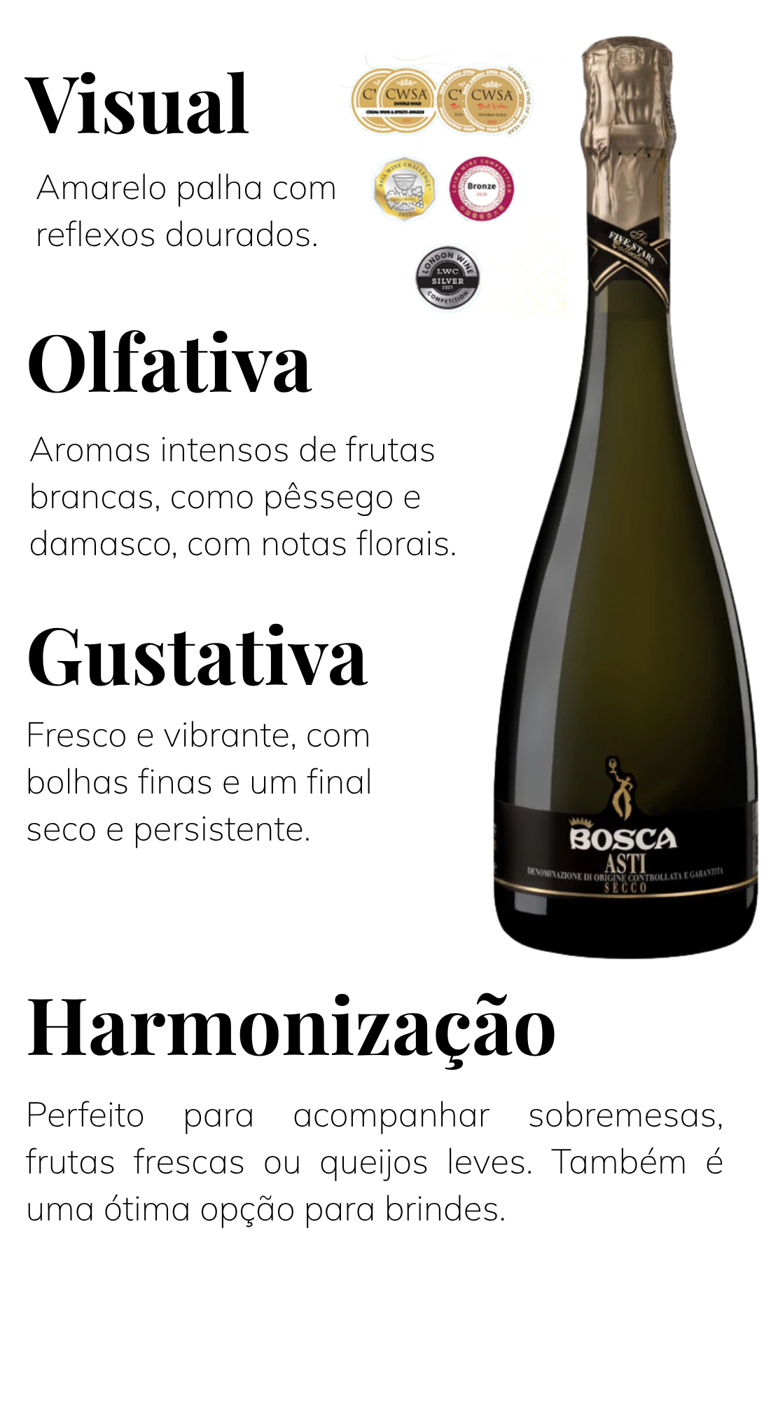 O espumante Bosca Asti Secco-DOCG, feito 100% de Moscato Bianco na região de Asti (Piemonte), é uma bolha elegante e surpreendentemente seca. Com aromas delicados de salvia e frutas cítricas, perlage refinado e um final de amêndoa e pomelo, trata-se de um aperitivo sofisticado ou acompanhamento perfeito para pratos leves.