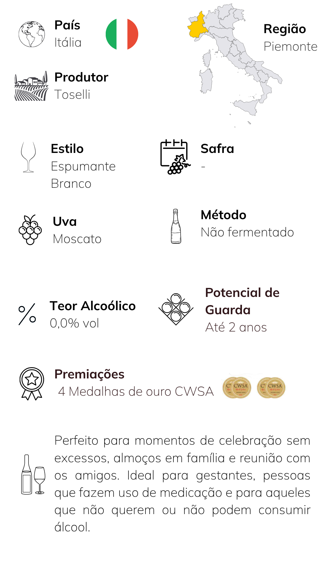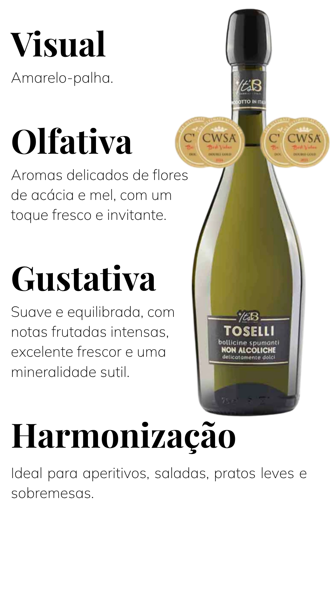 Os espumantes sem álcool da Toselli representam a elegância e o sabor do vinho italiano em uma versão leve. Produzidos na região do Piemonte, mantêm o frescor e o perfil aromático das uvas locais, passando por um processo cuidadoso de desalcoólização que preserva seus aromas e sabores naturais. Ideais para brindar com sofisticação em qualquer ocasião — sem abrir mão do prazer de uma boa taça.