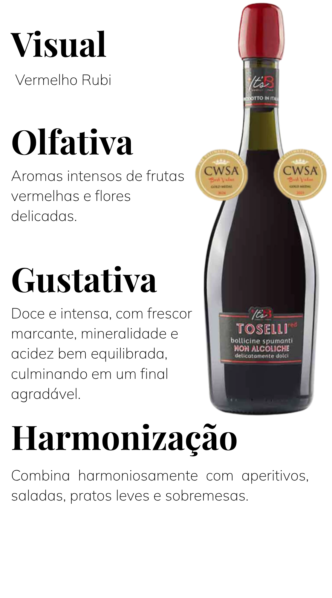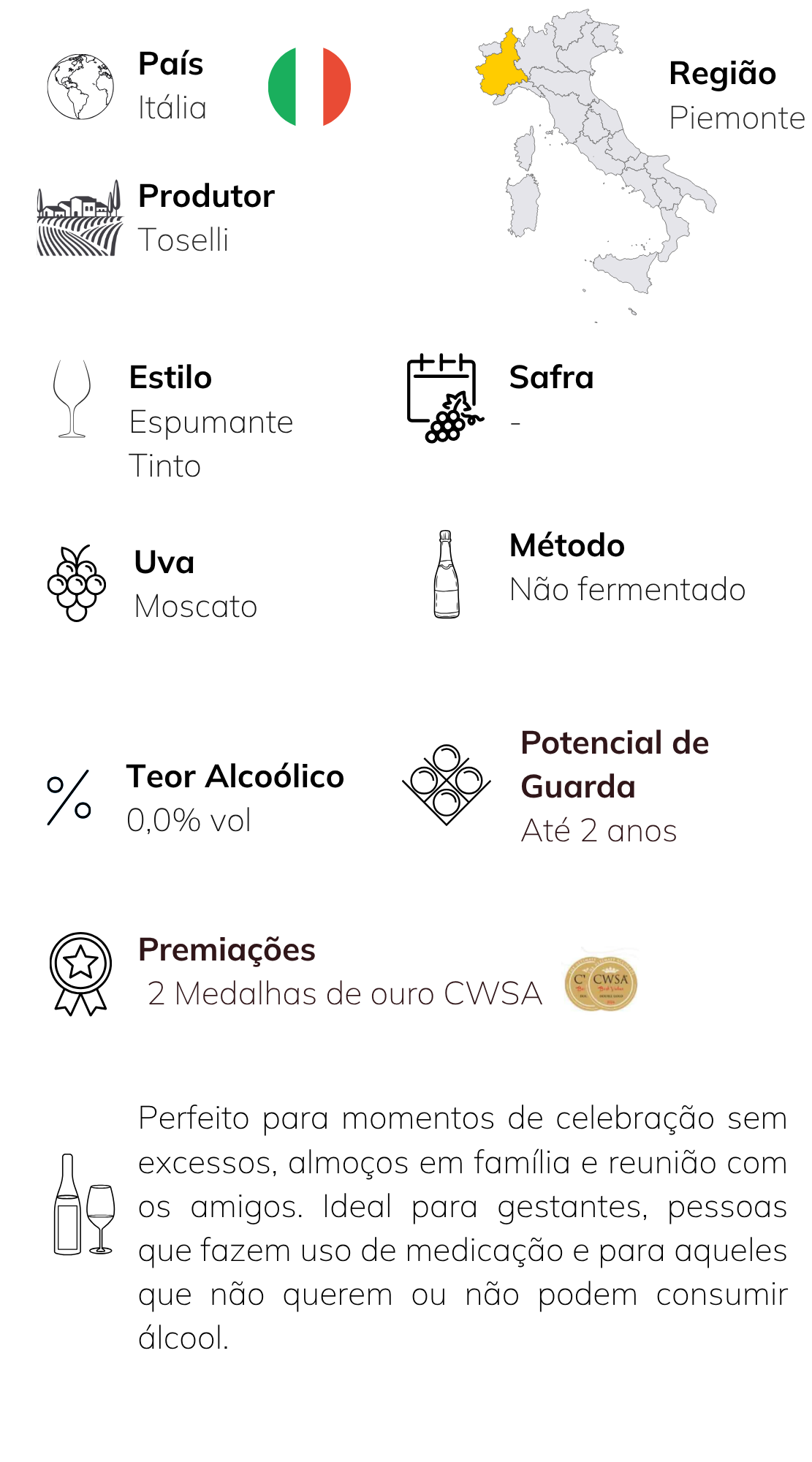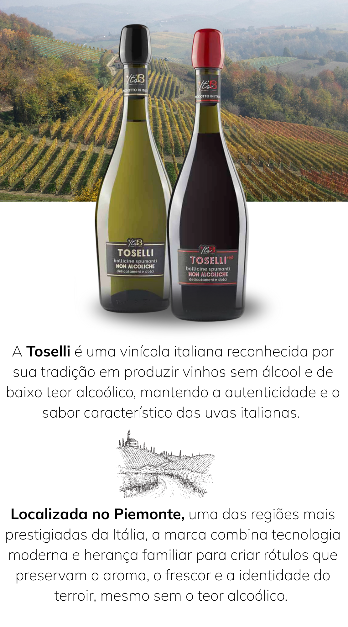 Os espumantes sem álcool da Toselli representam a elegância e o sabor do vinho italiano em uma versão leve. Produzidos na região do Piemonte, mantêm o frescor e o perfil aromático das uvas locais, passando por um processo cuidadoso de desalcoólização que preserva seus aromas e sabores naturais. Ideais para brindar com sofisticação em qualquer ocasião — sem abrir mão do prazer de uma boa taça.