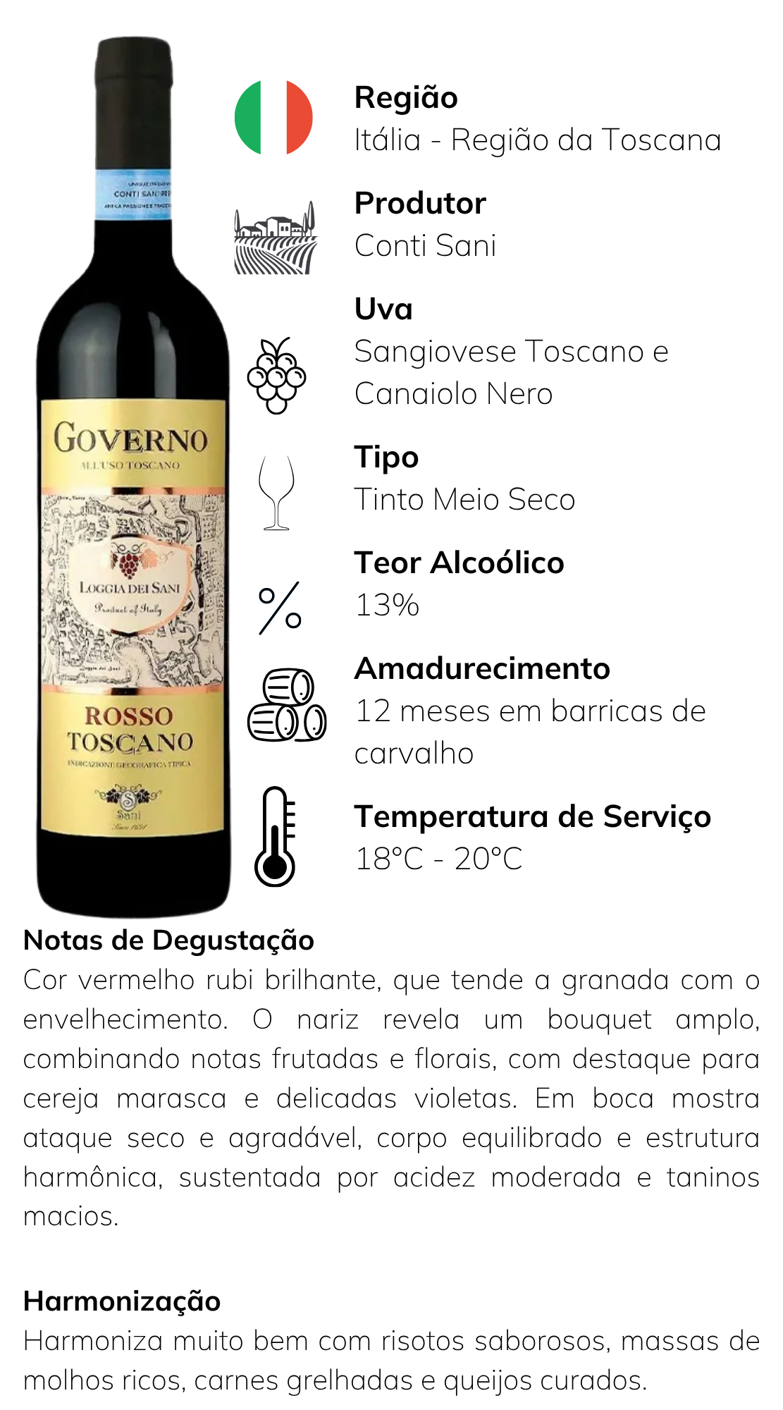 Do Vêneto, o L’Appassione, elaborado com uvas que passam pelo processo clássico de secagem natural em prateleiras antes da fermentação. Da Puglia, o Negroamaro Conte di Campiano, que utiliza a técnica Passito, onde as uvas secam na própria videira através da colheita tardia. E da Toscana, o Rosso Toscano Loggia dei Sani IGT, que aplica o método Governo, semelhante ao do Vêneto, trazendo estrutura e profundidade ao vinho. Três regiões, três estilos, um mesmo princípio: transformar o tempo e a natureza em vinhos mais intensos, complexos e envolventes.