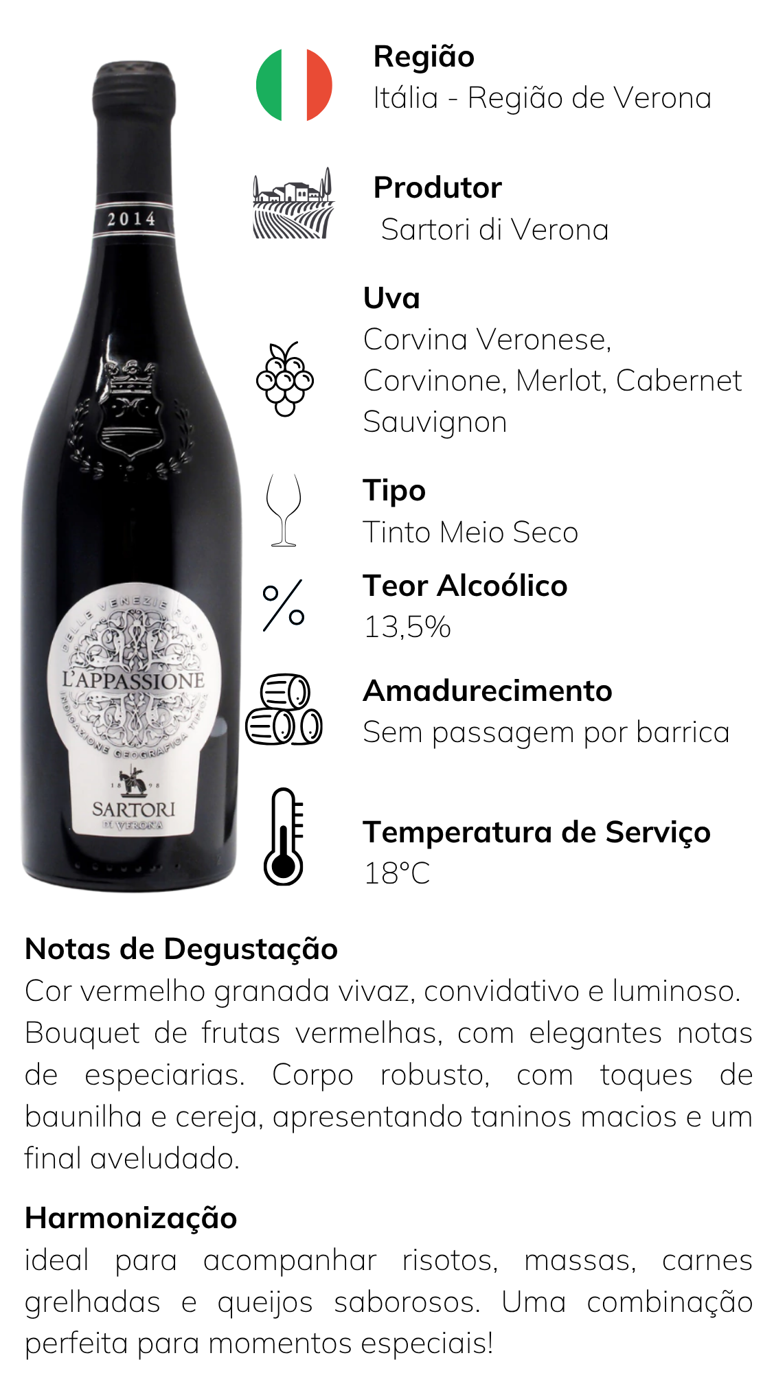 A safra do vinho pode variar de acordo com a disponibilidade em estoque.