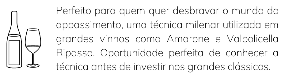 Este kit é um convite para quem deseja descobrir um dos maiores segredos da enologia italiana: o Appassimento. Um método milenar, tradicional em diversas regiões da Itália, que se expressa de diferentes formas — e até com nomes distintos —, mas sempre com o mesmo objetivo: concentrar aromas, sabores e textura no vinho. É a técnica por trás de alguns dos vinhos mais icônicos do mundo, como Amarone e Valpolicella Ripasso.