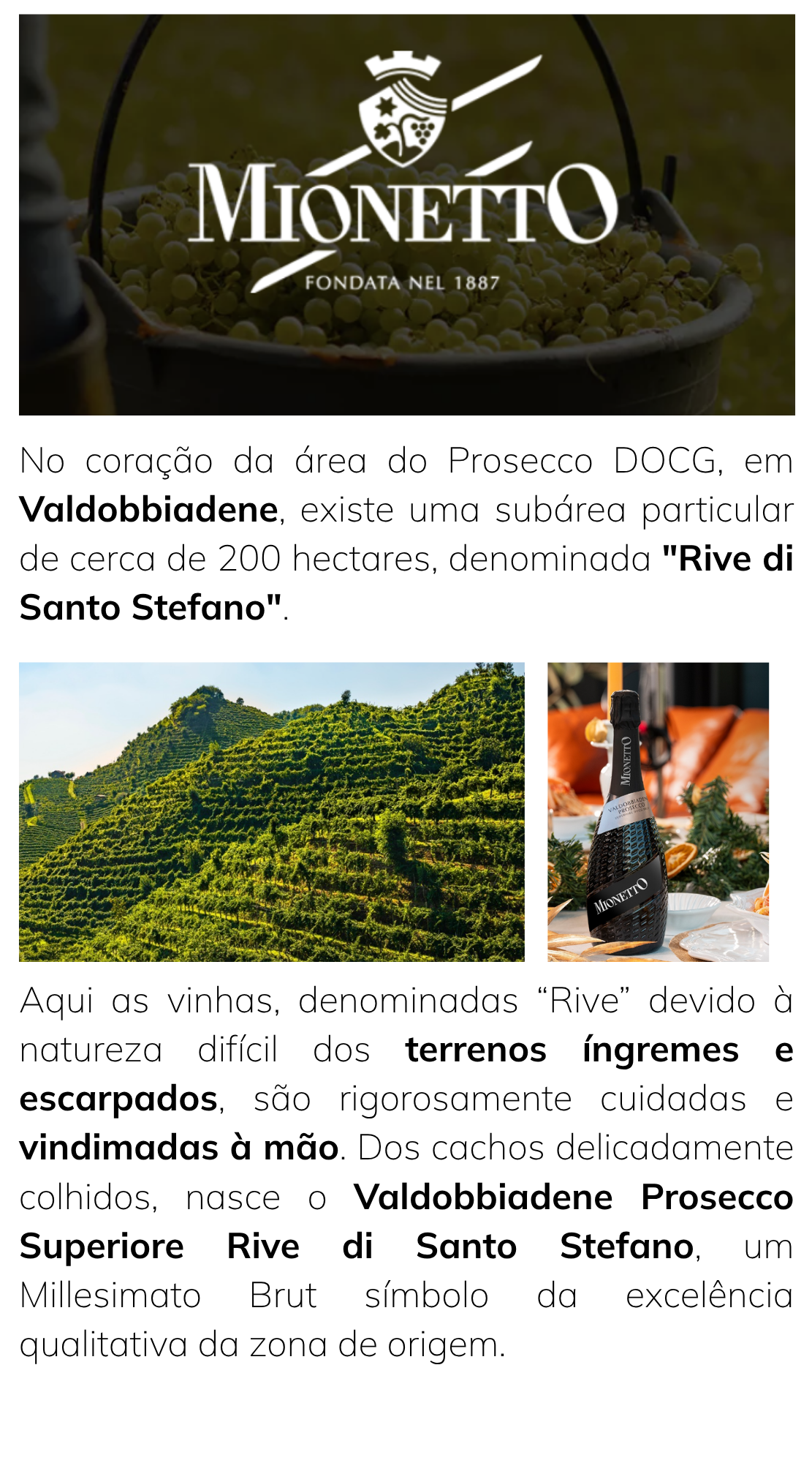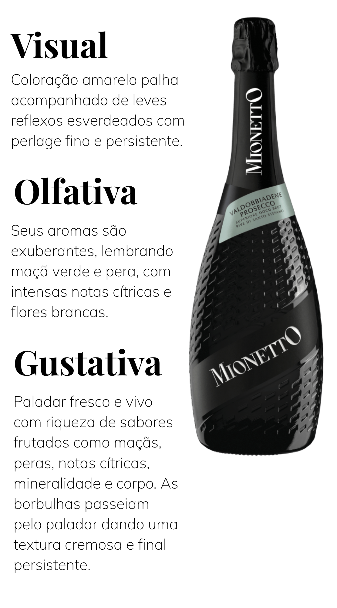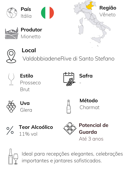 O Prosecco Mionetto é um espumante italiano elegante, produzido na região de Treviso, no Vêneto, com a tradicional uva Glera. Fundada em 1887, a Mionetto é referência na arte do Prosecco, entregando frescor, leveza e aromas delicados de maçã verde, pêra e flores brancas. Ideal para brindar momentos especiais, é perfeito como aperitivo ou para acompanhar entradas e pratos leves.