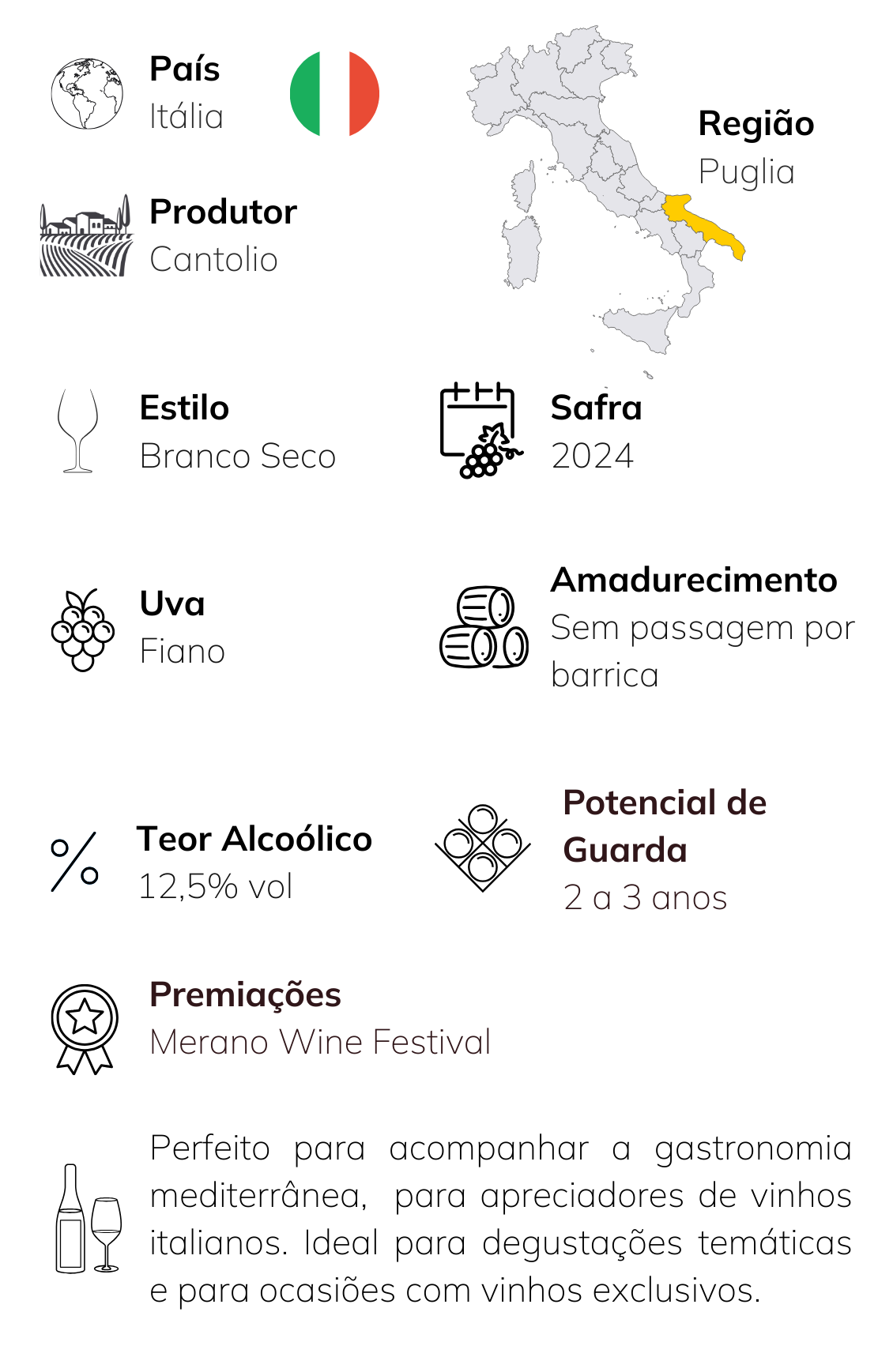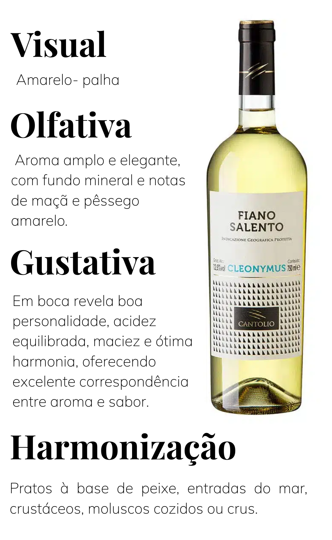 Cleonymus Fiano di Salento. Cleonymus homenageia um general espartano que combateu ao lado dos Tarantinos na antiguidade. A versão Cantolio da Fiano, uma das mais antigas variedades italianas, é leve, vibrante e floral, com uma textura untuosa na boca e leve nota salina. Representante digna na Puglia do que é, talvez, a melhor variedade branca italiana.