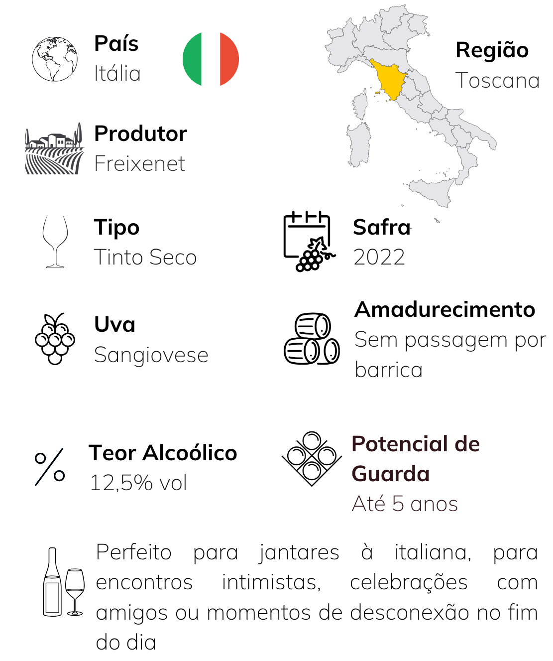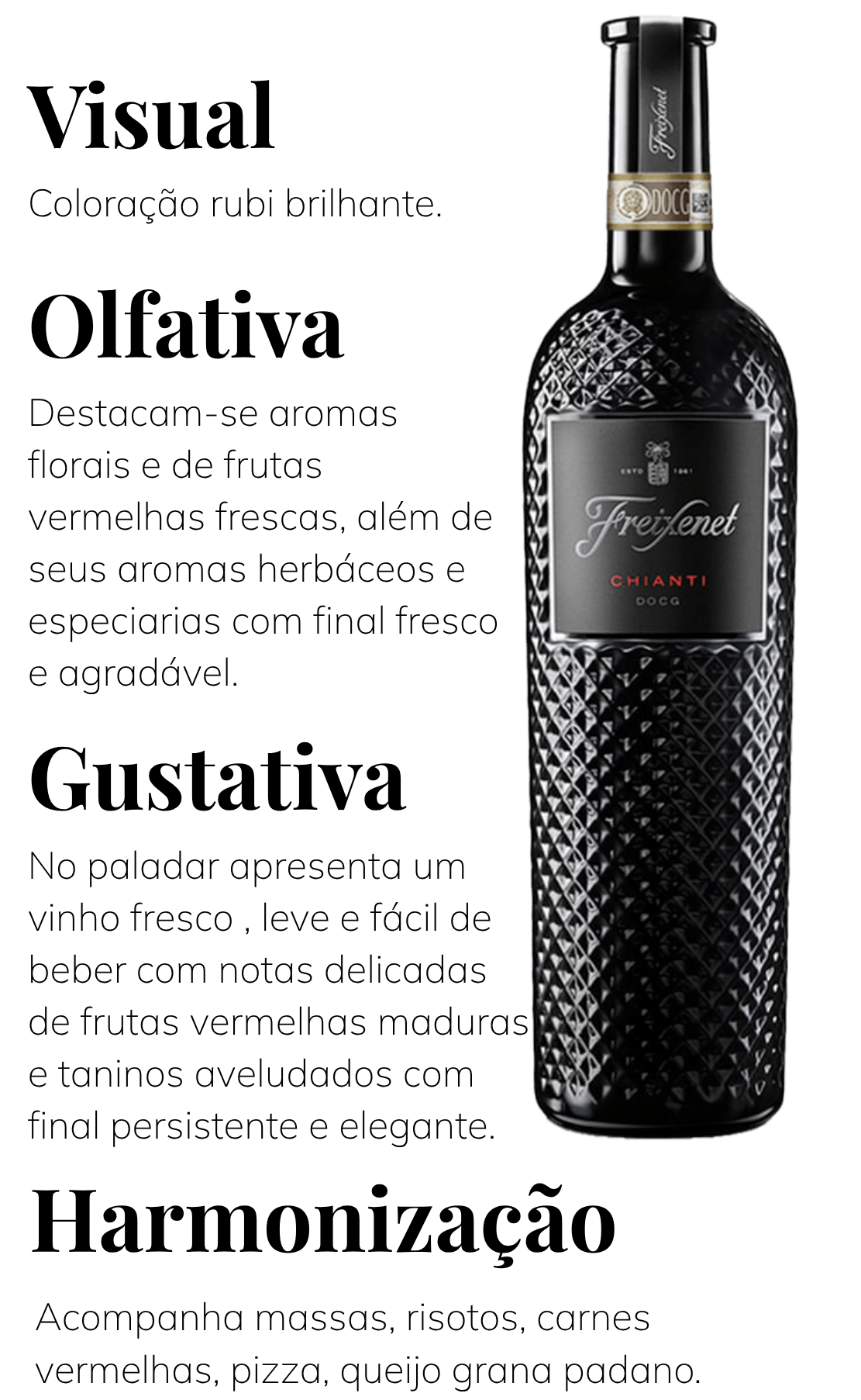 O Freixenet Chianti DOCG é um tinto italiano elegante, produzido no coração da Toscana a partir da uva Sangiovese. De cor rubi intensa, revela notas de frutas vermelhas maduras, especiarias e um toque sutil de carvalho. Um vinho equilibrado e envolvente, que expressa toda a tradição e o charme da viticultura toscana.