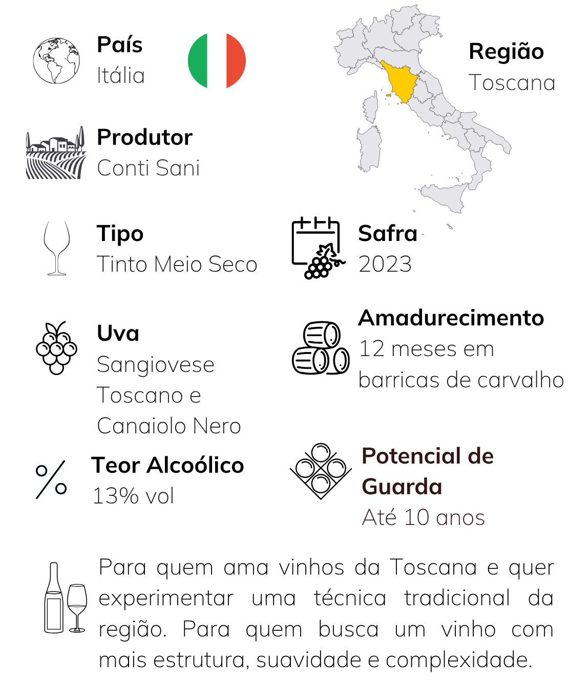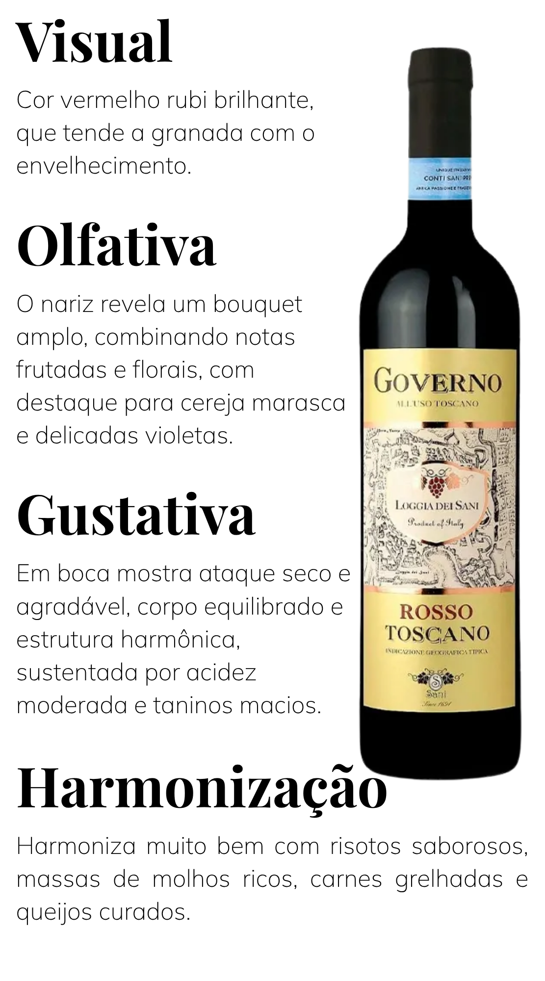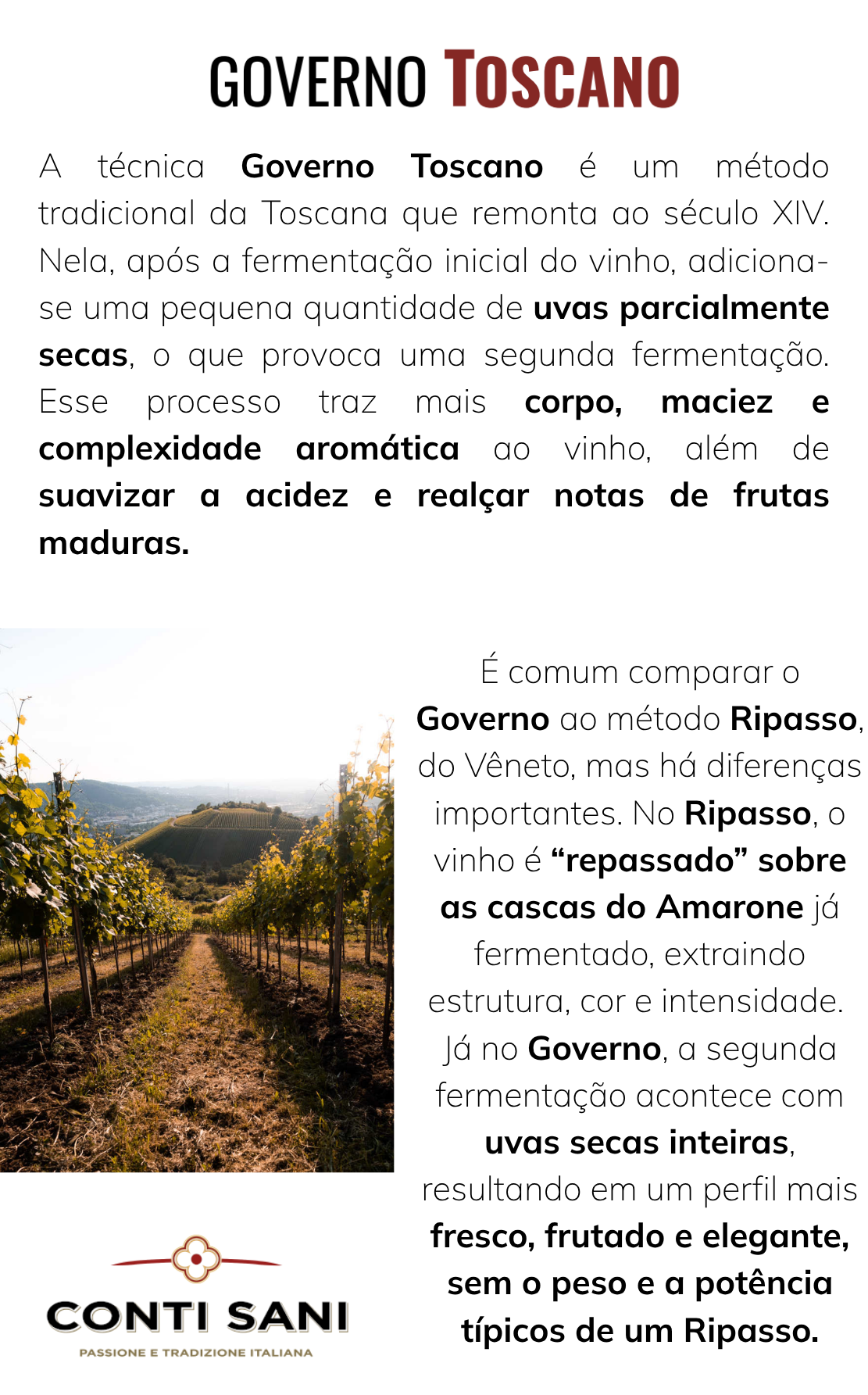Um tinto toscano elaborado pelo tradicional método Governo, a partir das uvas Sangiovese e Canaiolo cultivadas nas colinas da Maremma. A técnica Governo, com adição de uvas parcialmente secas na fermentação, confere mais estrutura, suavidade e complexidade ao vinho.
