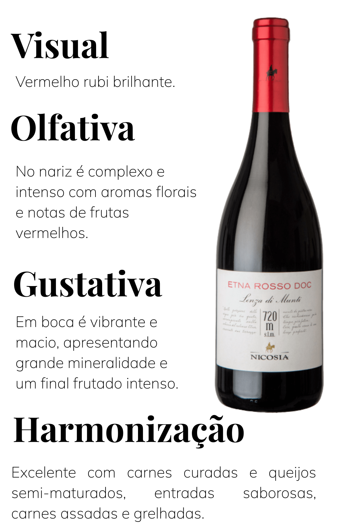 Nascido nas encostas do Etna, o vulcão mais ativo da Europa, o Lenza di Munti Etna Rosso 2023, expressa com autenticidade o caráter único dos solos vulcânicos da Sicília. Elaborado a partir de uvas nativas, entrega um perfil elegante, mineral e delicadamente frutado, com notas de cereja, ervas frescas e um toque defumado típico do terroir