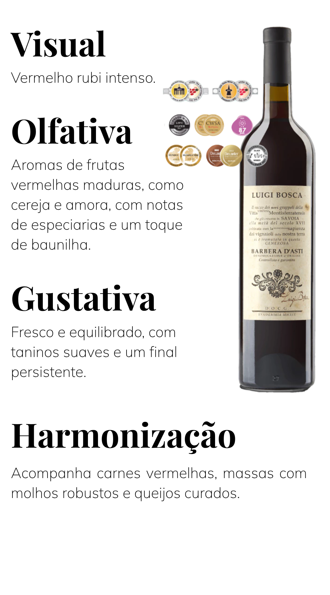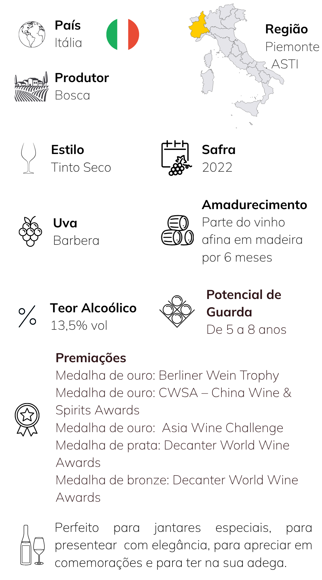 O Luigi Bosca Barbera d’Asti DOCG é um tinto italiano vibrante e expressivo, elaborado a partir da uva Barbera cultivada nas colinas ensolaradas de Asti, no Piemonte — região reconhecida por seus solos calcário-argilosos e clima equilibrado, que conferem frescor e elegância ao vinho.