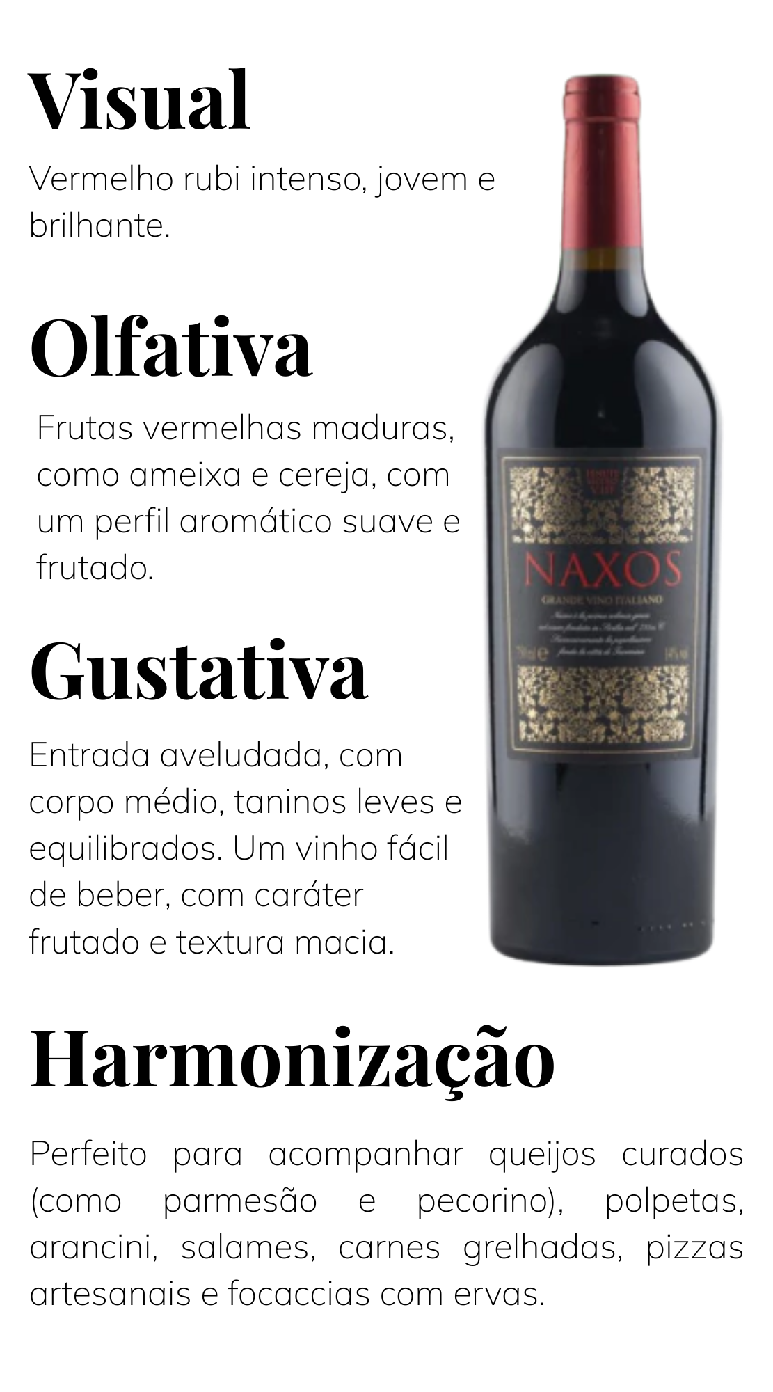 O nome Naxos homenageia uma antiga colônia grega na Sicília, reforçando o elo entre a história milenar da ilha e a produção vitivinícola atual. Com uvas Nero d’Avola e Nocera, esse vinho é um verdadeiro tributo à tipicidade do sul da Itália.