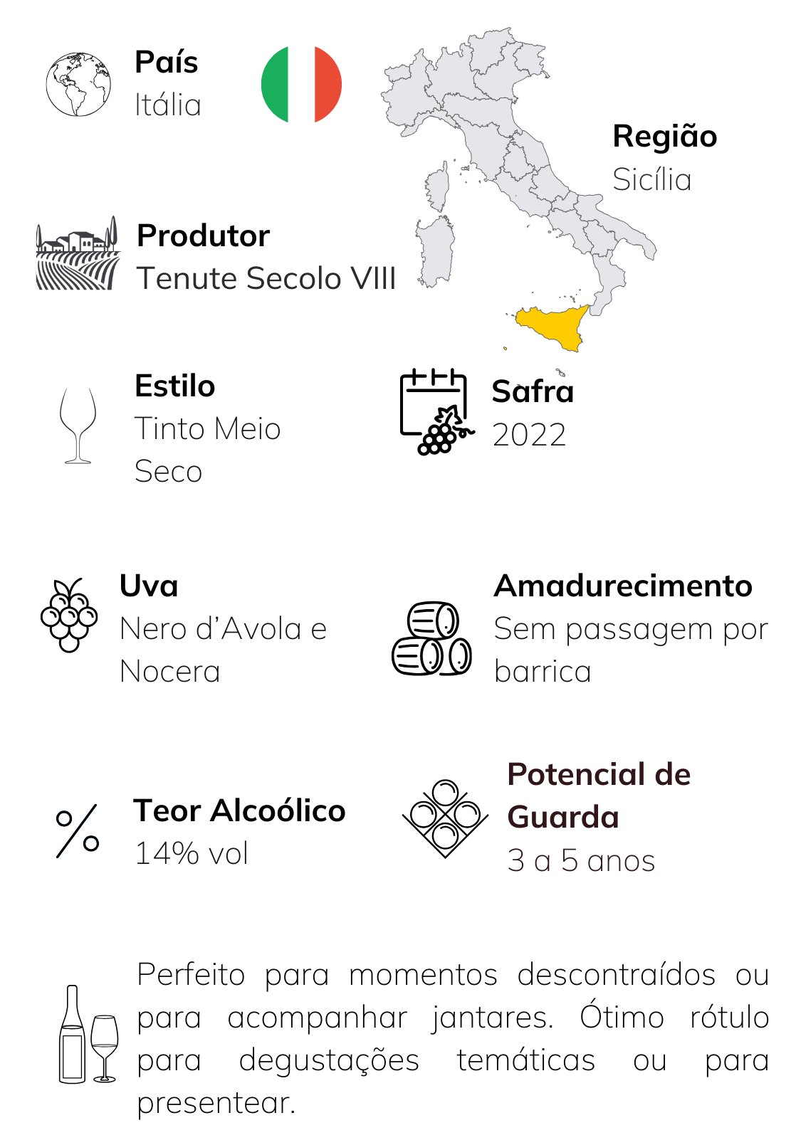 Produzido na charmosa região de Santa Lucia del Mela, na Sicília, o Naxos Rosso Terre Siciliane IGT é um tinto que expressa a herança cultural e a autenticidade da ilha. Assinado pela vinícola Tenute Secolo VIII, localizada na tradicional Tenuta Casale, o rótulo une tradição, identidade local e um estilo moderno e acessível.