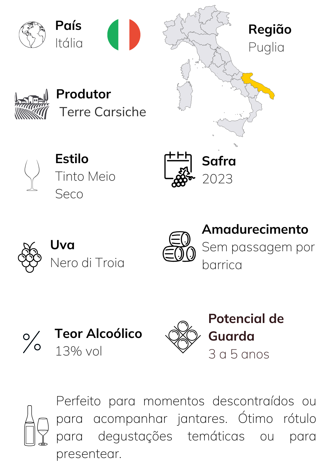O Nero di Troia Puglia IGT Terre Carsiche 1939 é um tinto de personalidade marcante, produzido na região de Castel del Monte, na Puglia. Elaborado com a uva autóctone Nero di Troia, expressa toda a tradição e autenticidade dessa terra. Assinado pela Terre Carsiche 1939, vinícola que combina técnicas modernas com o respeito às práticas históricas da viticultura italiana, este rótulo reflete o compromisso da casa em criar vinhos que unem qualidade, identidade e a essência do sul da Itália.