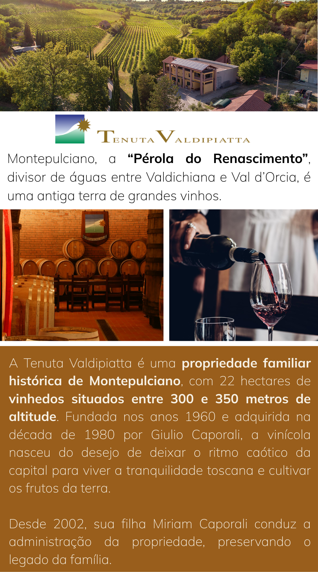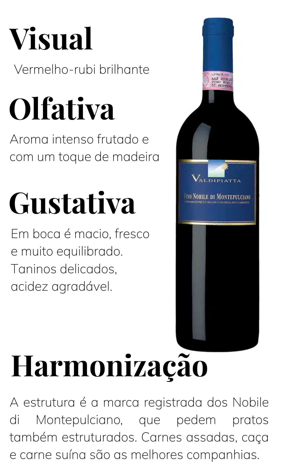 Vinho Tinto Tenuta Valdipiatta Vino Nobile di Montepulciano. A Montepulciano medieval era uma cidade de nobres, um raro lugar em que a classe privilegiada vivia em meio a seus vinhedos. Seus vinhos, portanto, são “nobres” não somente por sua qualidade, mas também por sua história. Refinado, intenso e persistente, o Nobile Valdipiatta mostra fruta, couro e especiarias.