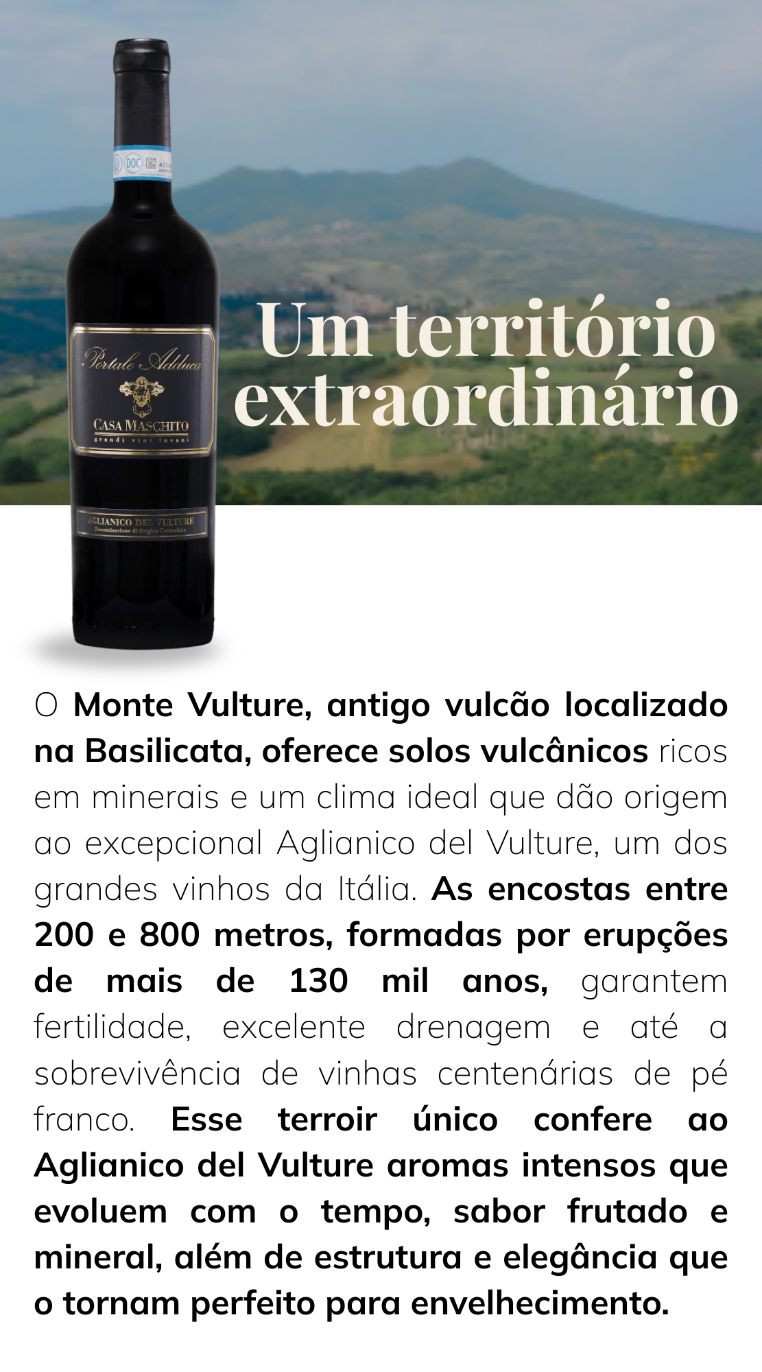 Na região de Basilicata, no coração do sul da Itália, nasce um dos vinhos mais emblemáticos e reconhecidos do país: o Aglianico del Vulture, conhecido mundialmente como o “Barolo do Sul”. Produzido pela vinícola Casa Maschito, este rótulo é fruto de uma tradição enraizada no respeito à terra e na valorização de um terroir único.