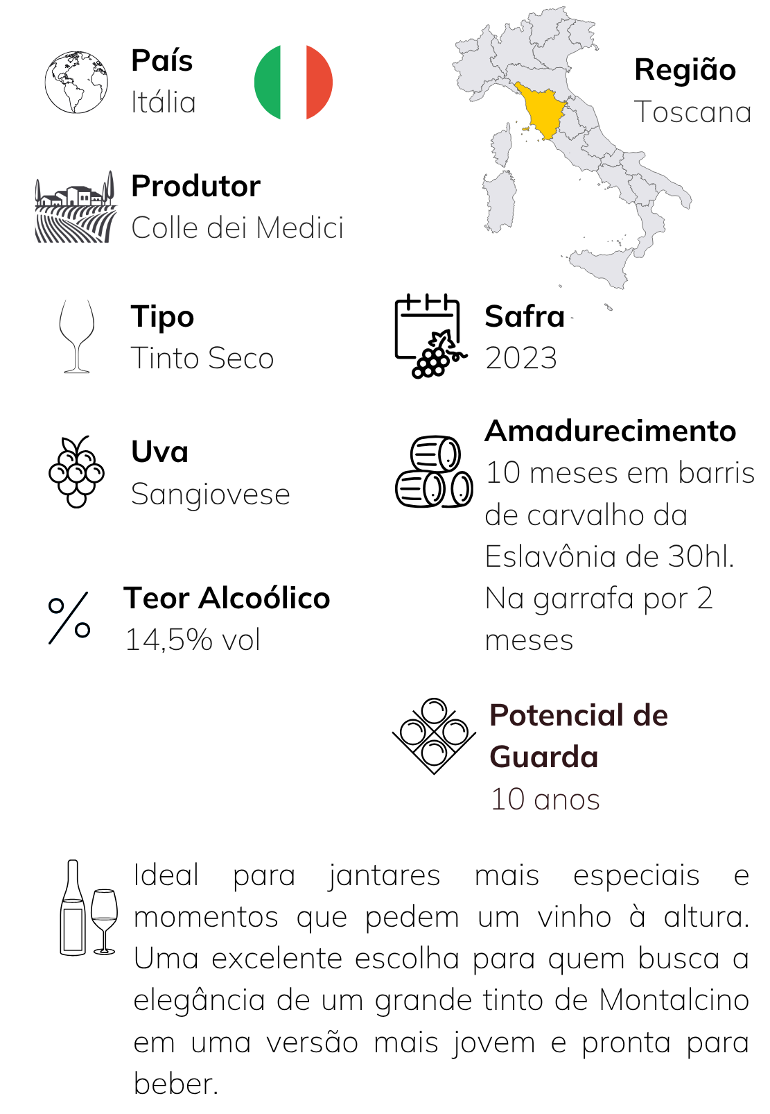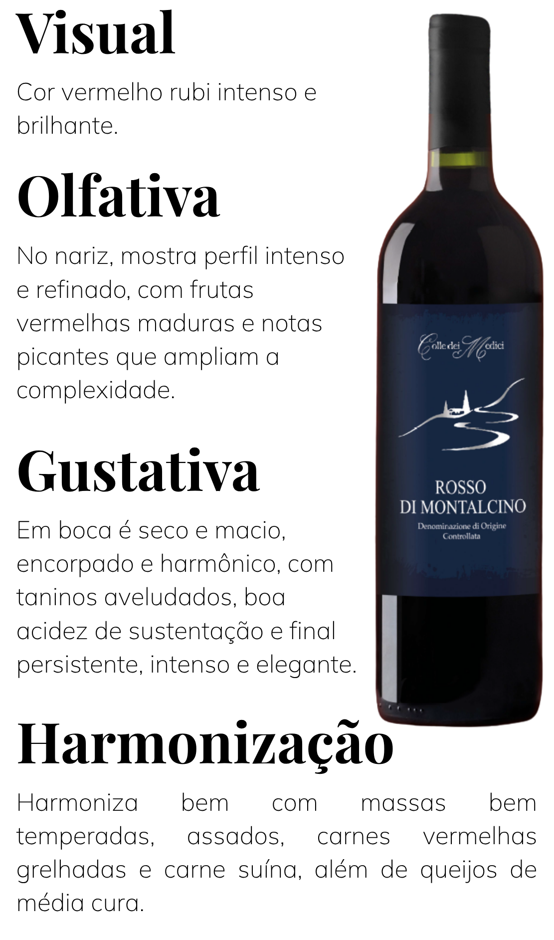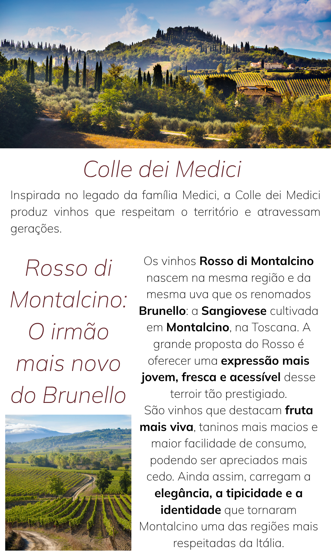 O Rosso di Montalcino Colle dei Medici DOC é um tinto toscano elegante e expressivo, elaborado com 100% Sangiovese nas colinas de Montalcino. Considerado a versão mais jovem e acessível do Brunello, entrega frescor e equilíbrio sem abrir mão da complexidade.