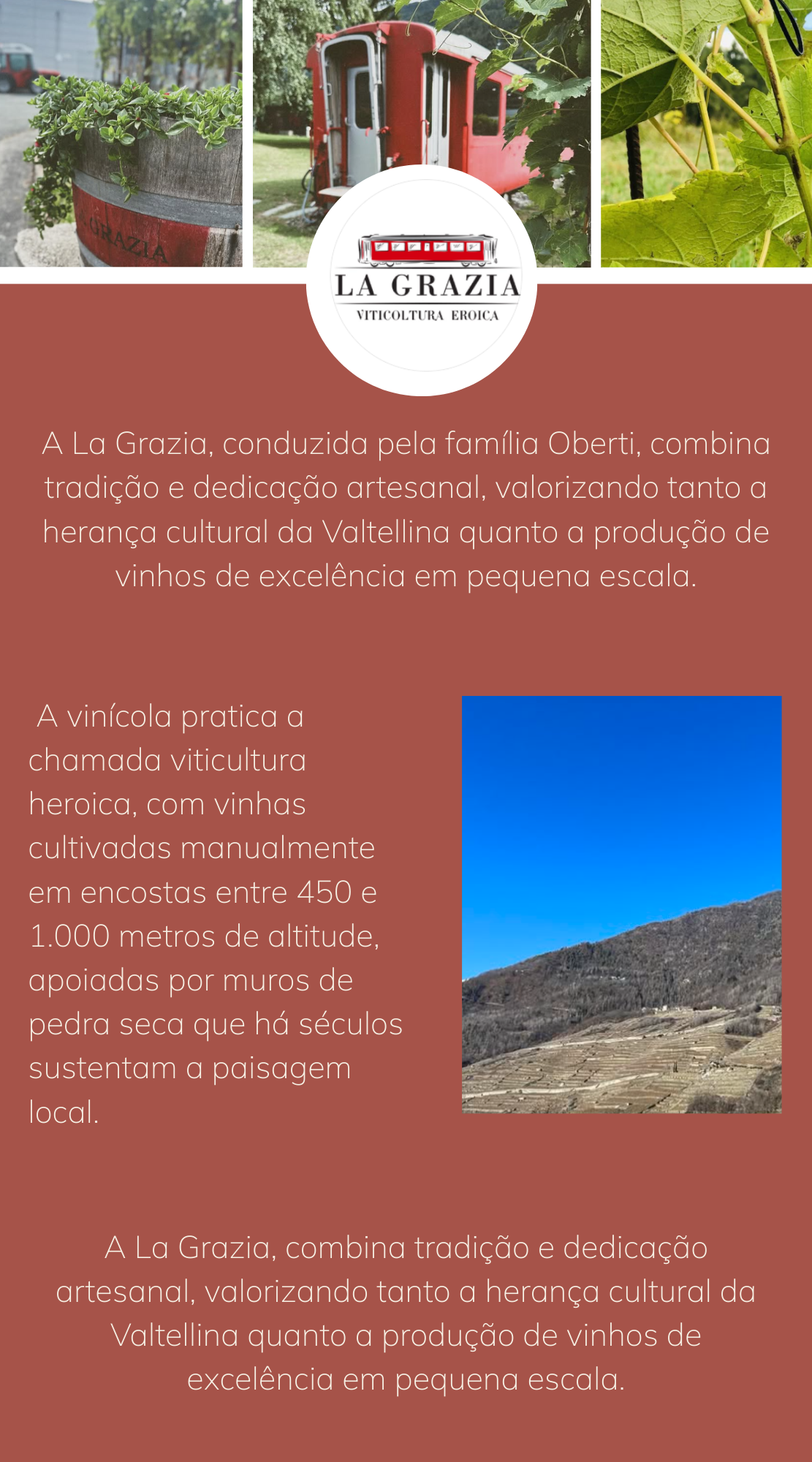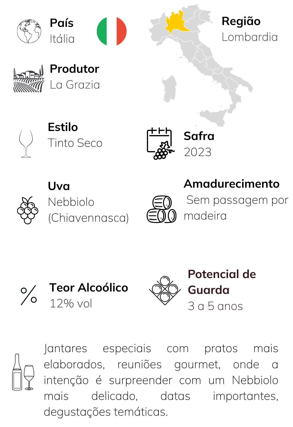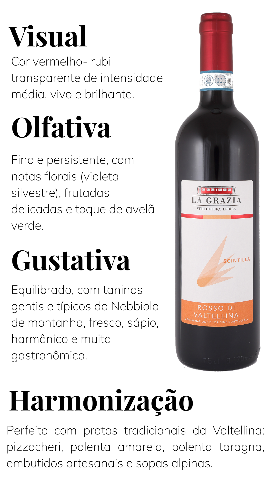 O Rosso di Valtellina DOC Scintilla, produzido pela vinícola La Grazia, nasce em um dos cenários mais emblemáticos da viticultura italiana: os terraços íngremes de Tirano, na região da Valtellina, província de Sondrio, na Lombardia. Esse rótulo é elaborado exclusivamente com Nebbiolo, conhecido na região como Chiavennasca, uma uva histórica que encontra nessas montanhas o equilíbrio ideal de solo, altitude e insolação para expressar sua identidade única.