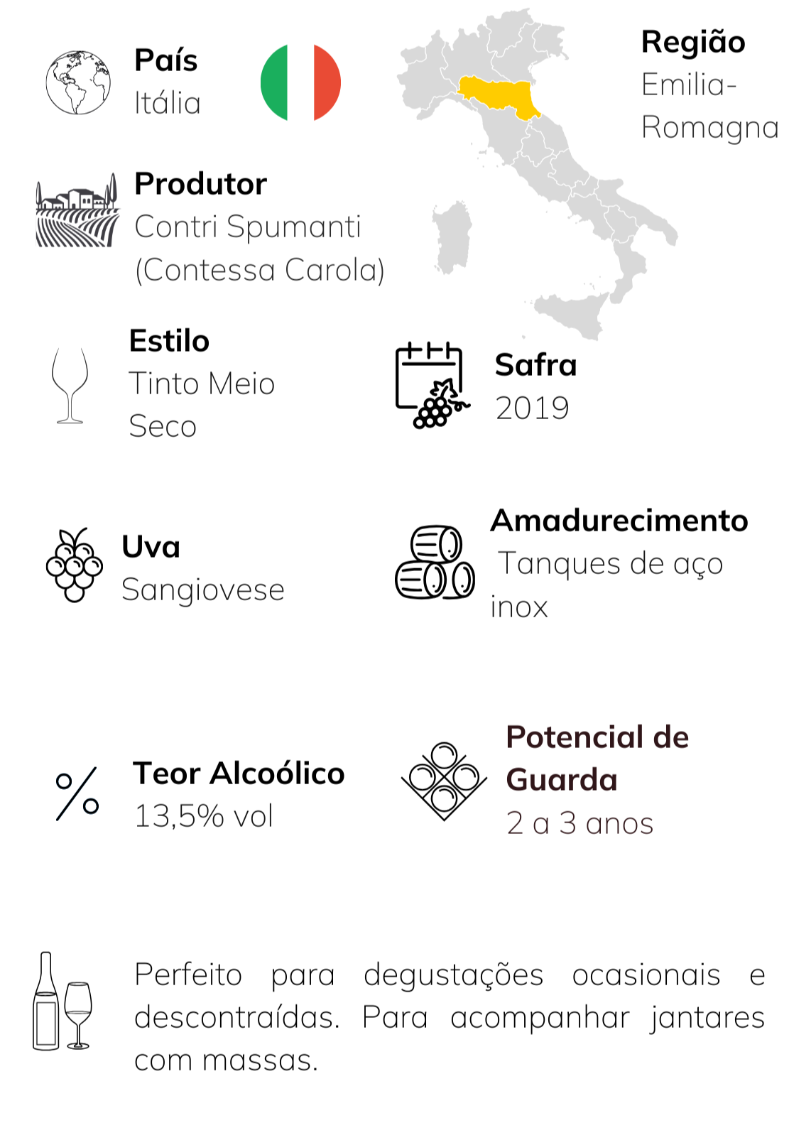Elegante e envolvente, o Contessa Carola é um Sangiovese da Emilia-Romagna que traduz com autenticidade o caráter da uva mais emblemática da Itália. Cultivado em solos argilo-calcários e bem ventilados próximos ao Mar Adriático, esse vinho entrega frescor, equilíbrio e um perfil gastronômico irresistível.