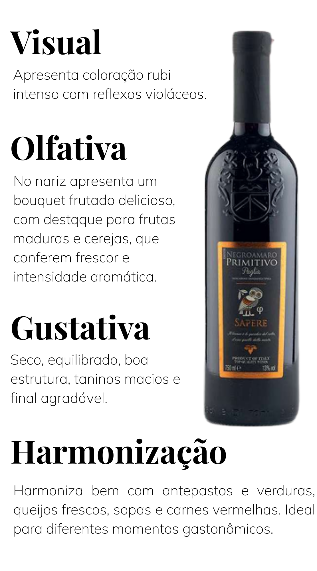 "Sapere" significa conhecimento — e este vinho convida à contemplação. No rótulo, a frase “Il bronzo è lo specchio del volto, il vino quello della mente” (O bronze é o espelho do rosto, o vinho o da mente) revela a proposta da garrafa: mais do que um tinto saboroso, uma experiência sensorial que reflete emoções, memórias e pensamentos. Um convite a saborear com calma e consciência.