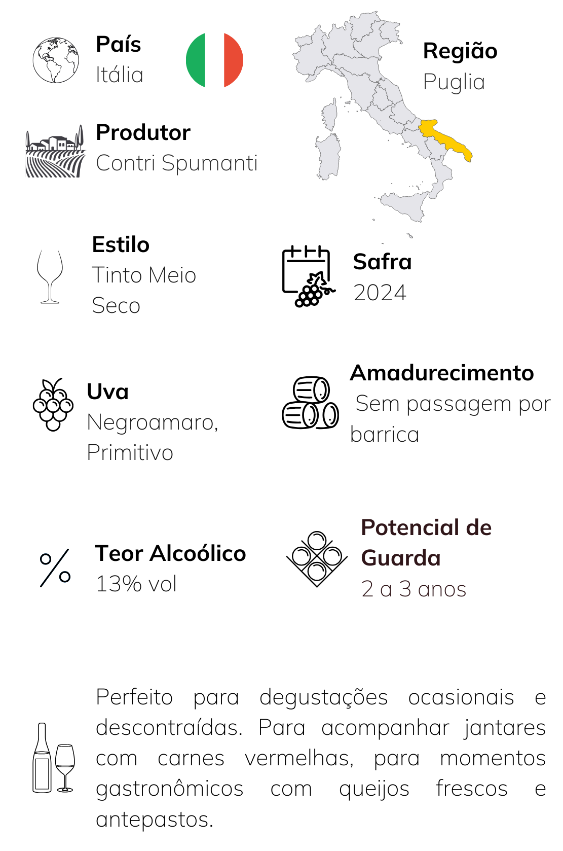 Um tinto envolvente do sul da Itália, elaborado com as uvas Negroamaro e Primitivo, cultivadas sob o sol generoso da Puglia. Produzido pela tradicional vinícola Contri Spumanti, entrega um estilo macio, frutado e fácil de agradar.