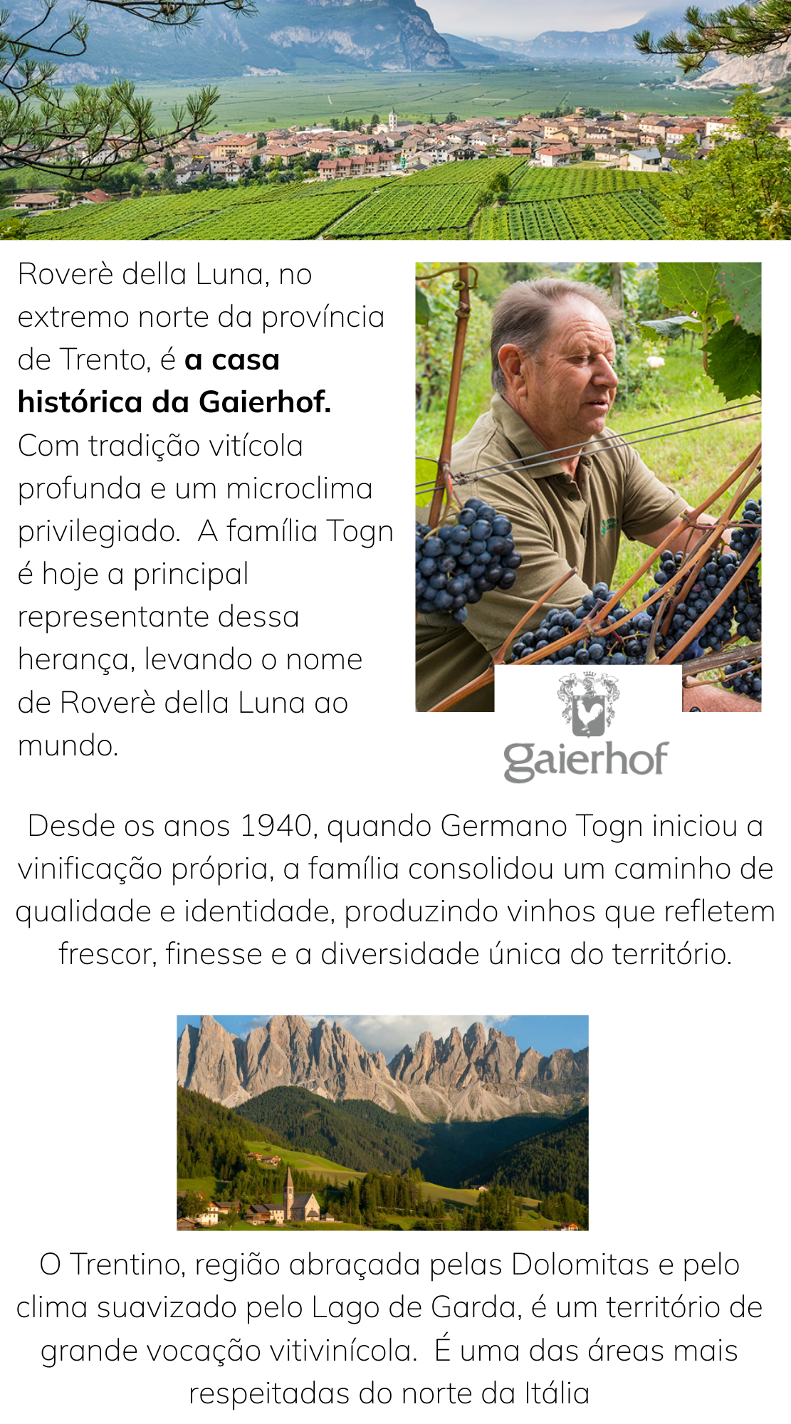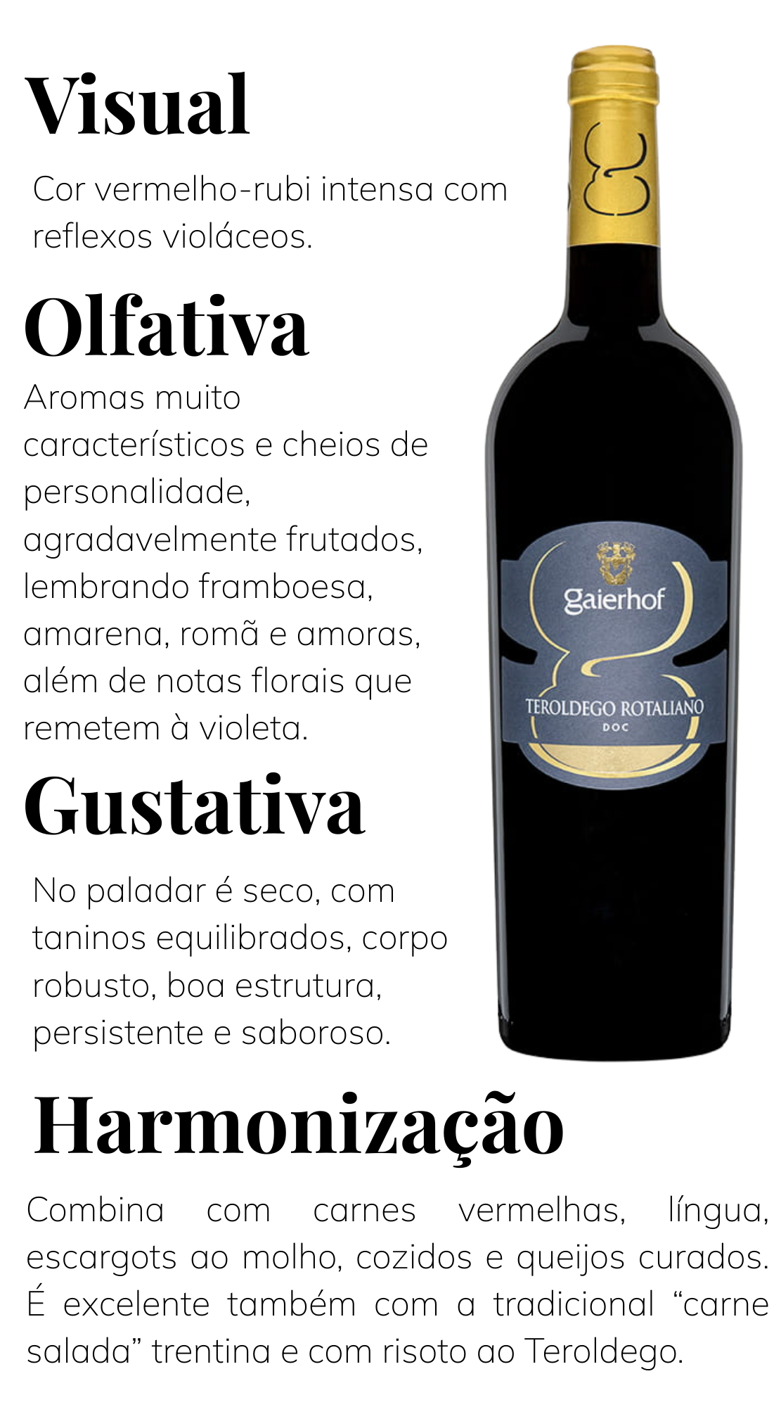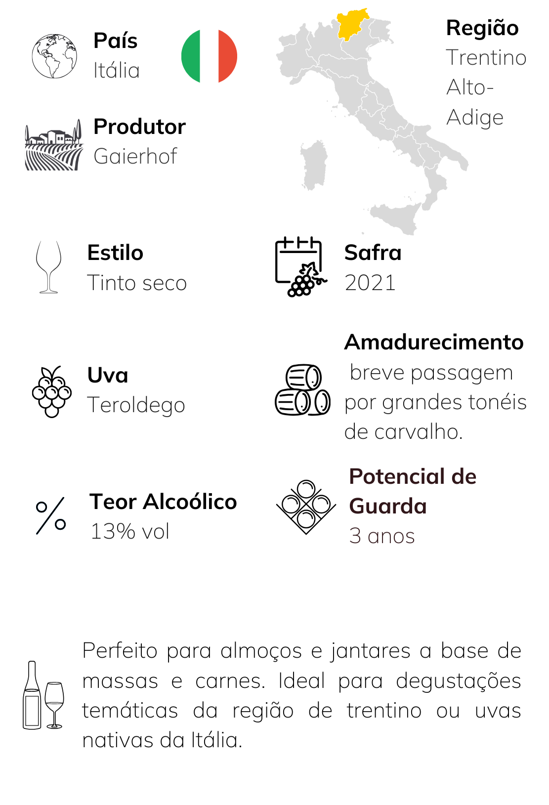 O Teroldego Trentino DOC Gaierhof representa a essência da vinícola instalada em roverè della luna, no coração do trentino. seu rótulo reflete a identidade alpina da região, conhecida pelo microclima fresco e pelos solos aluviais do campo rotaliano, berço histórico da uva teroldego. A Gaierhof valoriza essa tradição com um estilo limpo e contemporâneo, destacando a autenticidade e a força do terroir, de onde nascem vinhos intensos, estruturados e marcados por frutas escuras e notas florais típicas da variedade.