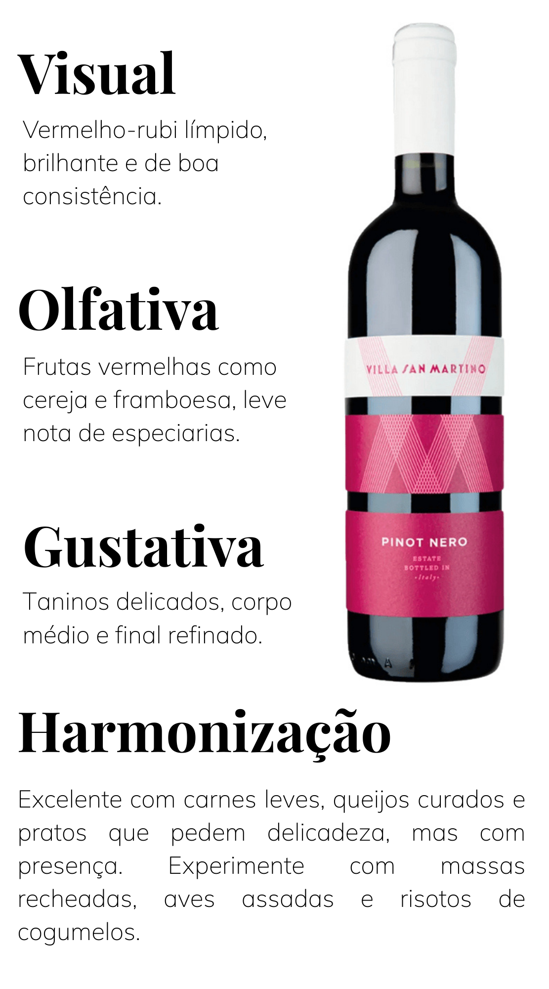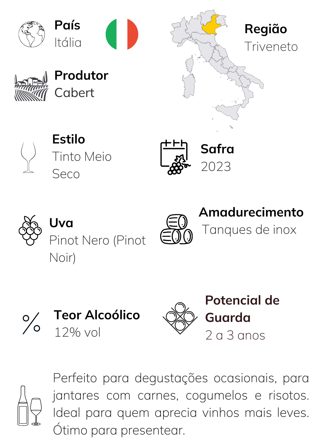 Um tinto italiano elegante, delicado e cheio de personalidade. Produzido pela tradicional Cantina di Bertiolo (Cabert), na região de Triveneto, este Pinot Nero expressa toda a finesse da uva cultivada em solos aluviais com camada superficial pedregosa — terroir que favorece aromas mais intensos e refinados.