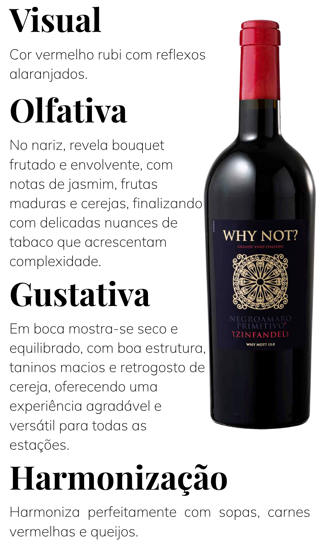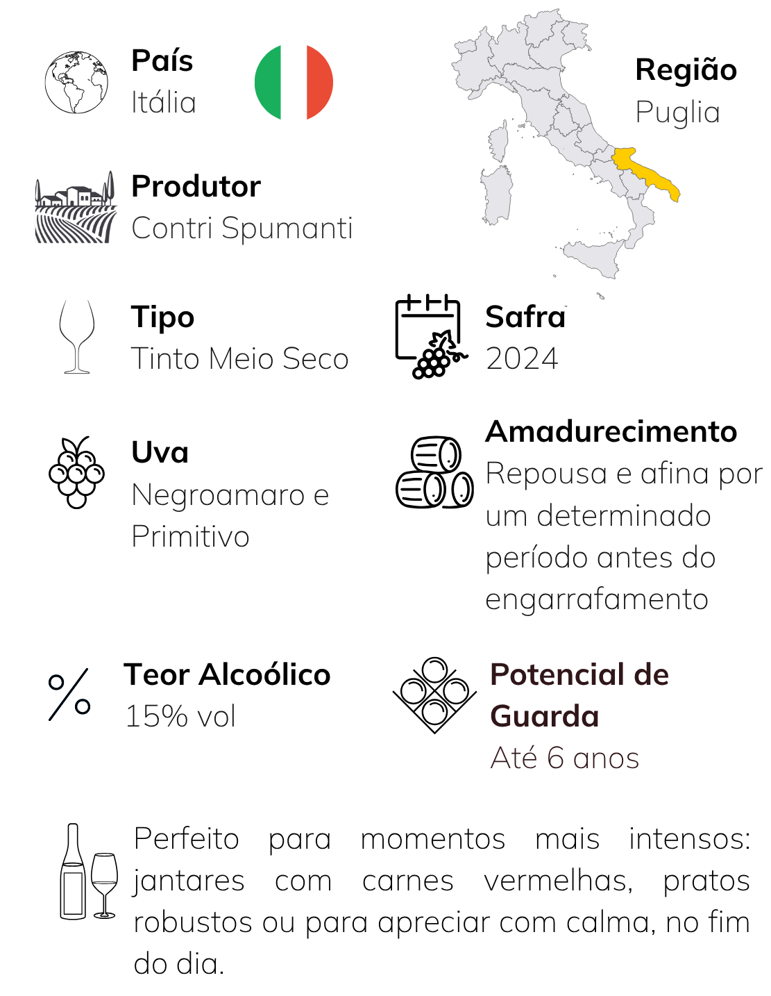 Um tinto envolvente do sul da Itália, elaborado com as uvas Negroamaro e Primitivo, cultivadas sob o sol generoso da Puglia. Produzido pela tradicional vinícola Contri Spumanti, entrega um estilo macio, frutado e fácil de agradar.