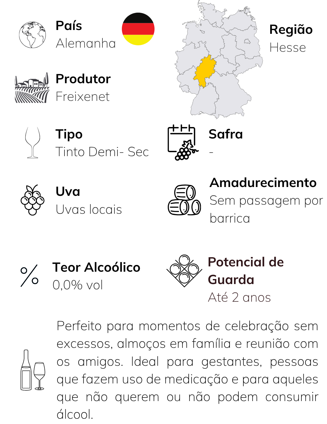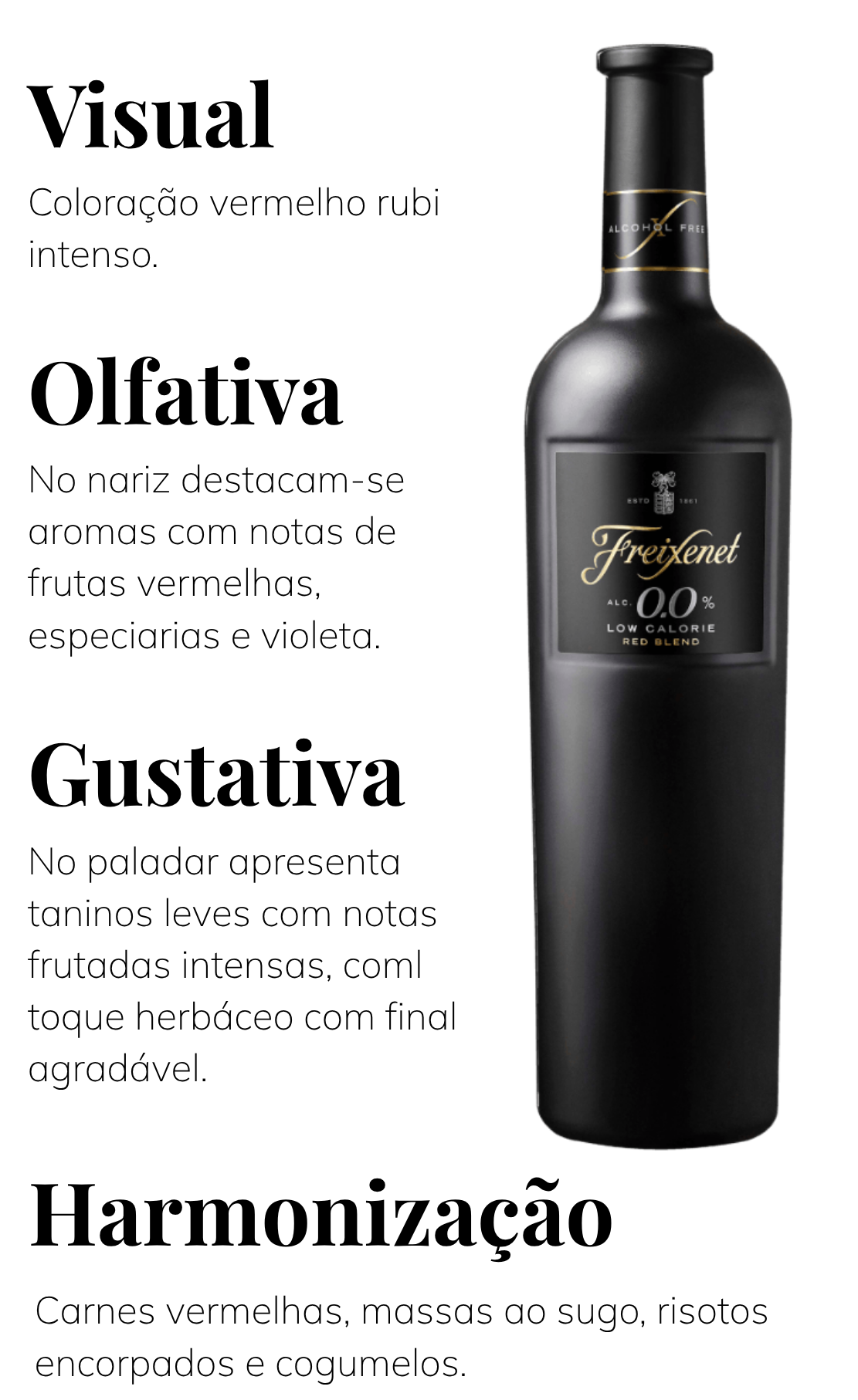 A Freixenet 0.0 é a expressão do prazer de brindar com leveza e sofisticação. Produzido a partir de vinhos cuidadosamente elaborados e depois desalcoolizados, preserva o frescor, os aromas frutados e a elegância que tornaram a marca mundialmente reconhecida. É a escolha ideal para quem busca uma experiência refinada sem abrir mão do sabor e do estilo Freixenet — perfeita para qualquer momento, a qualquer hora.